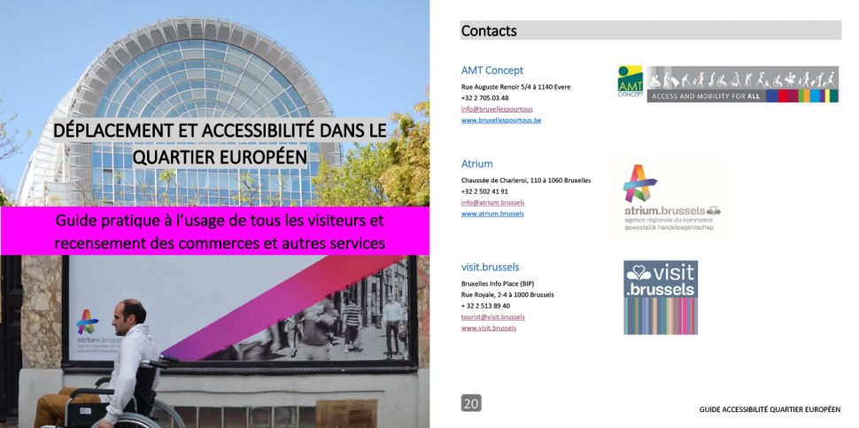 This new guide offers travel advice and suggestions regarding the accessible touristic places in the European quarter and is destined to persons with reduced mobility. Later on, this guide should be useful for all persons with a disability. For travel agencies, this guide could be a practical tool and could stimulate service providers to ’do better’ such as transport or lodging. Ultimately, this guide could be interesting for all visitors concerned about their comfort and safety during their travels. Essentially this document identifies all accessible places (hotels, restaurants, pubs, fast?food, shops, public services, post offices, banks, pharmacies, doctors,…) in the European quarter.